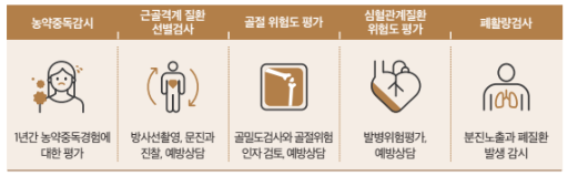 여성농업인이 농작업을 함으로써 자주 발생할 수 있는 질병을 예방하기 위한 건강검진으로 근골격계, 심혈관계, 골절 및 손상위험도, 폐기능, 농약중독 등의 5개 영역 10개 항목에 대해 2년 주기로 검진을 지원하는데요, 농작업성 질환의 조기 진단과 사후관리, 예방교육 및 전문의 상담도 제공합니다. 이러한 검진 비용의 90%를 지원합니다.