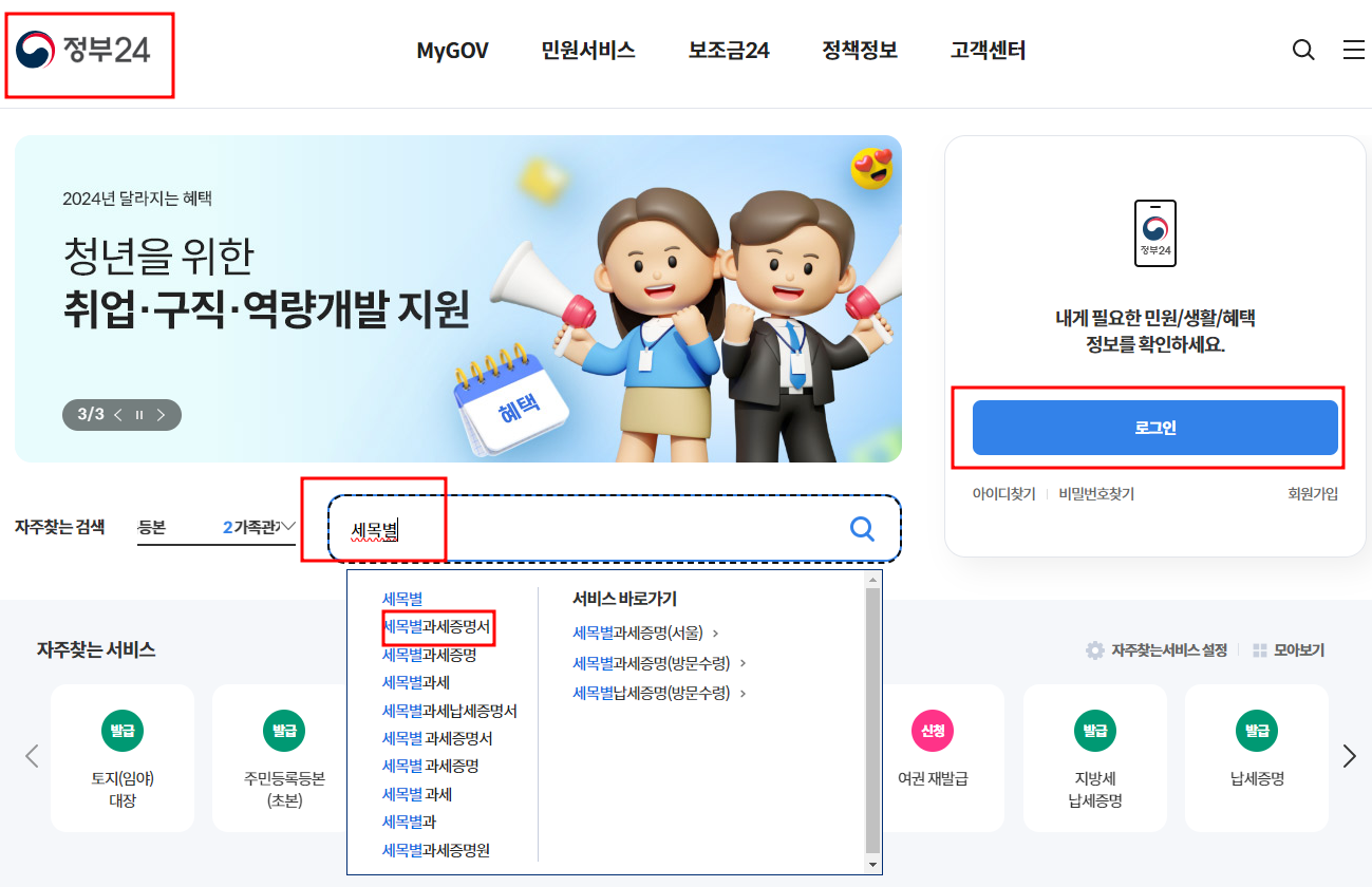 ☑️ 2. 로그인을 한 후 검색창에 "세목별과세증명서"를 검색합니다.